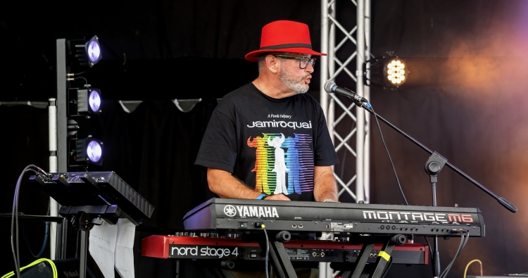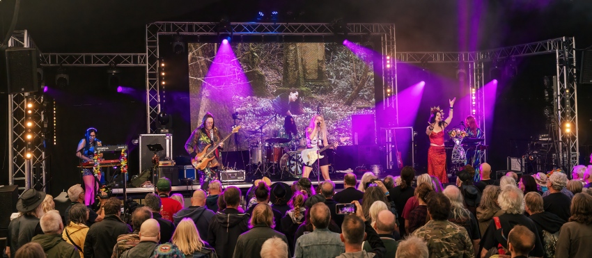 Musician chats over it was time to take in the multitude of bands that were playing. First up, in the smaller marquee, Kingfisher Stage, was the Dancing Wu Li Masters. At first, like many of the acts that were to follow, I was not sure what to expect. Sometimes the band name can allude to the music that they supply but thankfully they were not some mix of high kicking fights and terpsichorean moves, either in sequins or white pyjamas. Instead, they were high energy funk rock that gave the audience a great start to the festival and, from the way that they were moving to the music they were in the groove and enjoying the whole set. If there was any anxiety about being the first to play it didn’t show and the guitarist showed that any pressure was not impacting on his skill and talent.