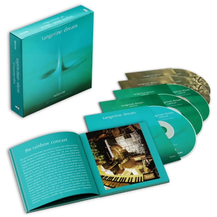 The Rubycon 50th anniversary set is another thoughtful and carefully put together release from Cherry Red Records, consisting of five CDs along with a detailed and nicely illustrated booklet containing a new essay from Tangerine Dream expert Wouter Bessels. So, what is included? Well the first disc has the remastered stereo mix of Rubycon, with a bonus track featuring an extended introduction to Rubycon, mixed by Steve Wilson. The next four discs cover two concerts, one at the Rainbow, London in 1974, and the other The Royal Albert Hall during 1975.