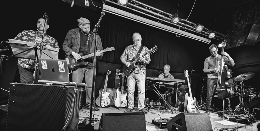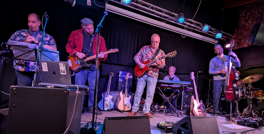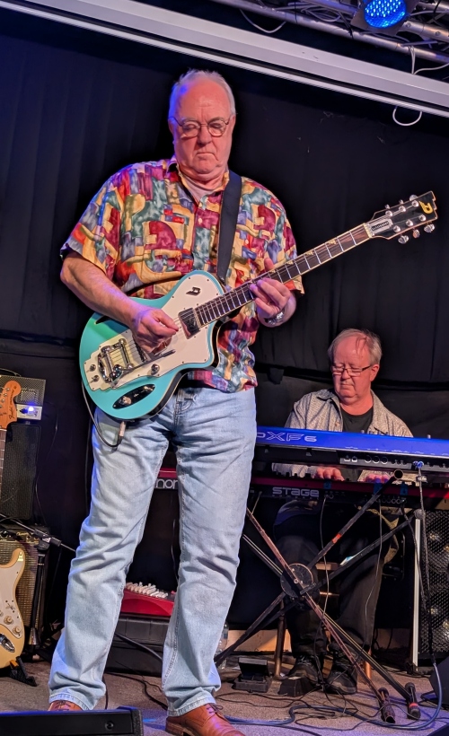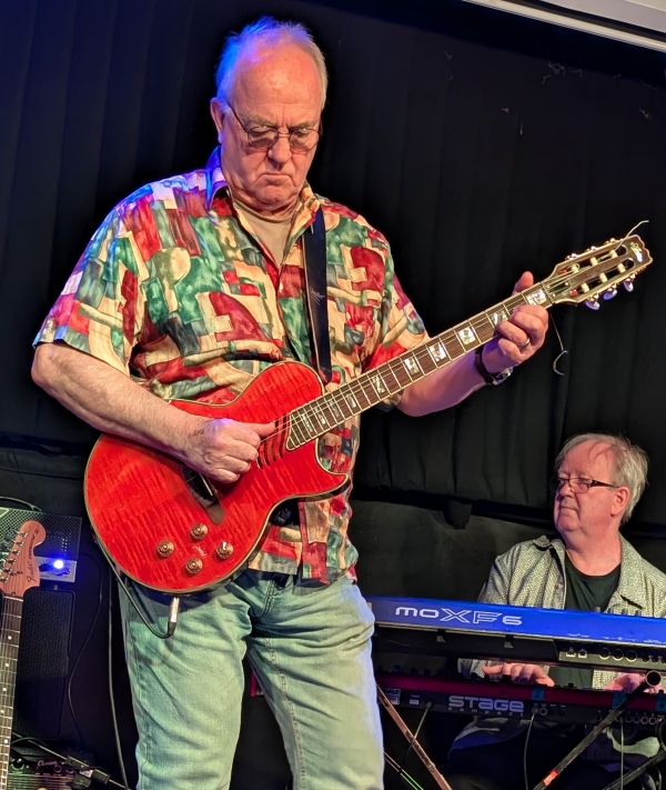 While we’re on unusual instruments, James Grant on bass alternates between a conventional four string bass guitar and a beautiful electric double bass. While that captures your eye, Andy Panayi the sax and flute player is getting well funky stage left as we look. And now, Robbie has picked up another prime example of six string craftsmanship called an Aria. It’s an enticing shade of orange. 🙂